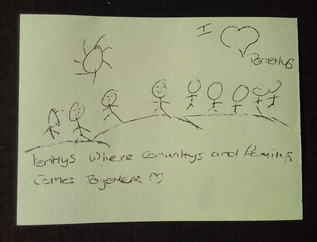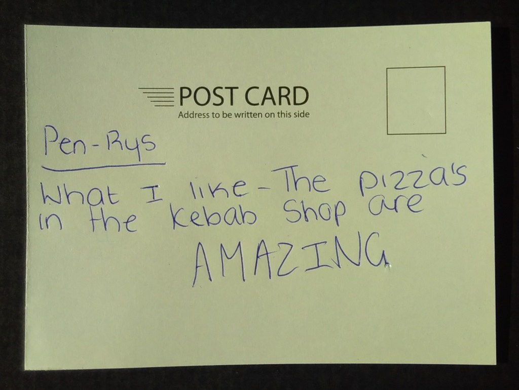 The Penrhys Pilgrimage Project is working to restore an ancient walking route between Llandaff Cathedral in Cardiff and Penrhys in the Rhondda. At a coffee morning in Penrhys at Llanfair Uniting Church, I invited local residents, visitors and stakeholders to write and/or draw postcards about what makes Penrhys special to them.